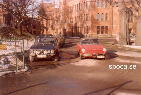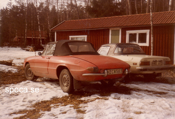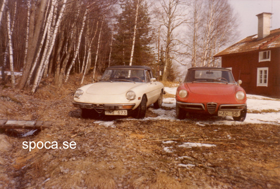 - Alforna plockas fram efter vinterförvaringen en tidig vårdag 1978, batterierna är laddade och bilarna startar snällt. den vänstra Alfan en rundhäck är en serie1 Spider som tillverkades 1966-1969 och den högra Alfan en serie2 Spider som tillverkades 1970-1982.