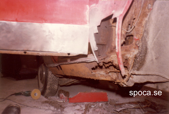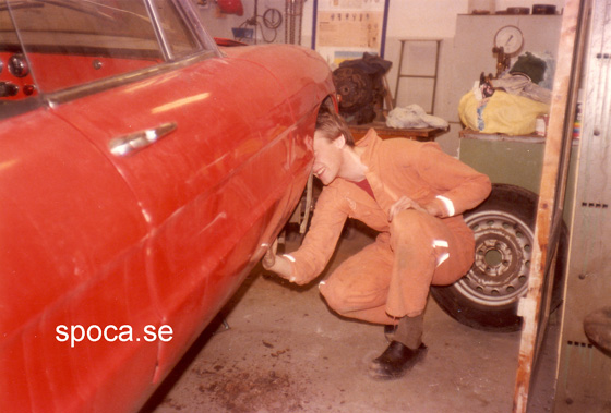 - Äntligen var rosten lagad och nu återstår spackling, slipning och lackering. Men först pallades bilen upp och Plastic Padding och en pansarfil inhandlades, sen började ett tålamodskrävande arbete.