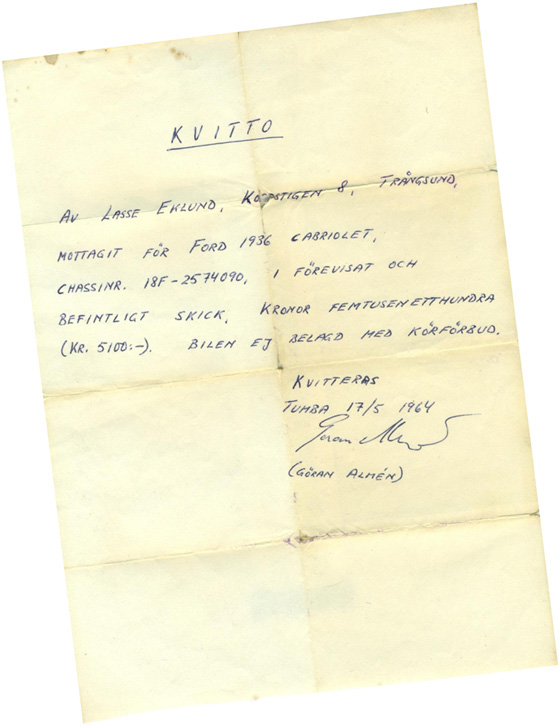 17 maj 1964 byter Ford 36.an ägare och säljs för 5100 kronor till Lasse Eklund. Bilen var då i ett fint skick och lackerad i en mörkblå nyans, kanske Washington Blue. Lars hottar nu till bilen med ny blå metallicklack, silverflakad sufflett, fotbrädor, torpedvägg och golvmattor kläs i röd badrumsmatta. Dörrsidor och övrig klädsel i svart galon med ribbor. På bilskroten i Skarpnäck hittar Lars nya stolar från en bil som heter Glas.
