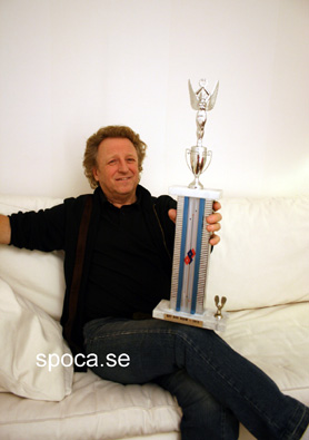Jan Lanemo med segerpokalen från Hot Rod Show, fotograferad 2013-02-11, till höger avtalet med Hot Rod Show och underskrivet av Jan Lanemo och Bo Sandberg.