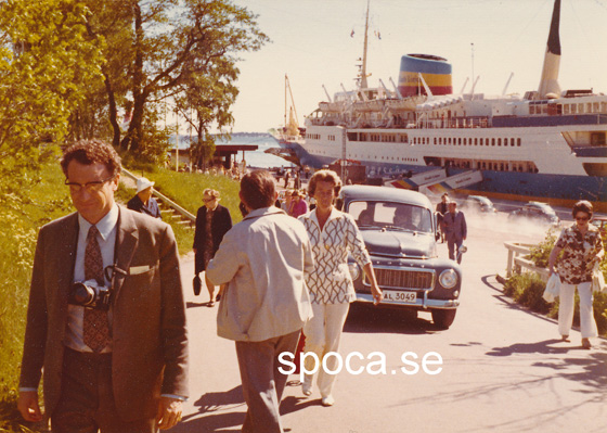 - Båten har precis kommit in till Mariehamn, mannen i Volvo Duetten har hämtat flickvännen och bilarna bakom väntar på att få åka ombord. Notera damerna som är så fint sommarklädda i blommiga och randiga blusar till vita byxor.