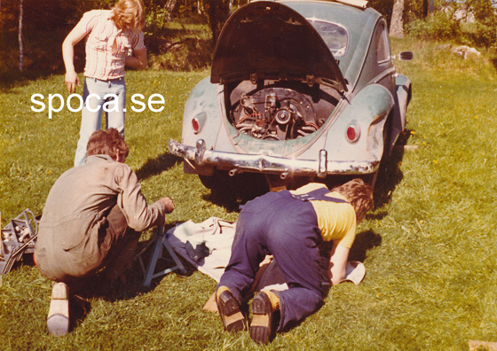 - Nyinköpt VW 1200 från 1959, Ronny, Klas och Lasse byter här koppling på Bubblan. Men först ska bilen pallas upp och motorn plockas ut. Intressant var att Folkan var utrustad med stora soltaket och vita blinkers. Tyvärr var den högerstyrd.
