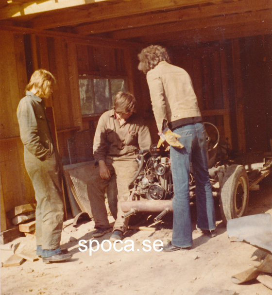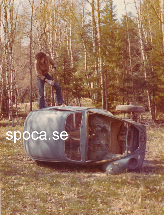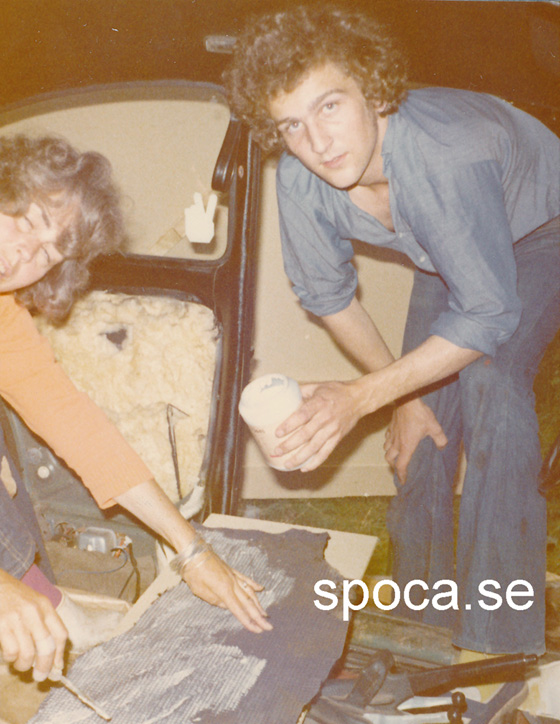 - Säljaren var lite vild och galen, det ryktades att han av misstag kört in i receptionen på ett fint hotell på Sturegatan. Alla skärmarna var buckliga, ena framhjulet stod alldeles snett (positiv cambervinkel). Kopplingen var helt slut. Men vad gjorde det bilen var ju billig och felen åtgärdades snabbt med hjälp av några kompisar. Mannen till vänster var skrothandlare inom metaller och skrotade bland annat Hamburgerbryggeriet och Münchenbryggeriet.
